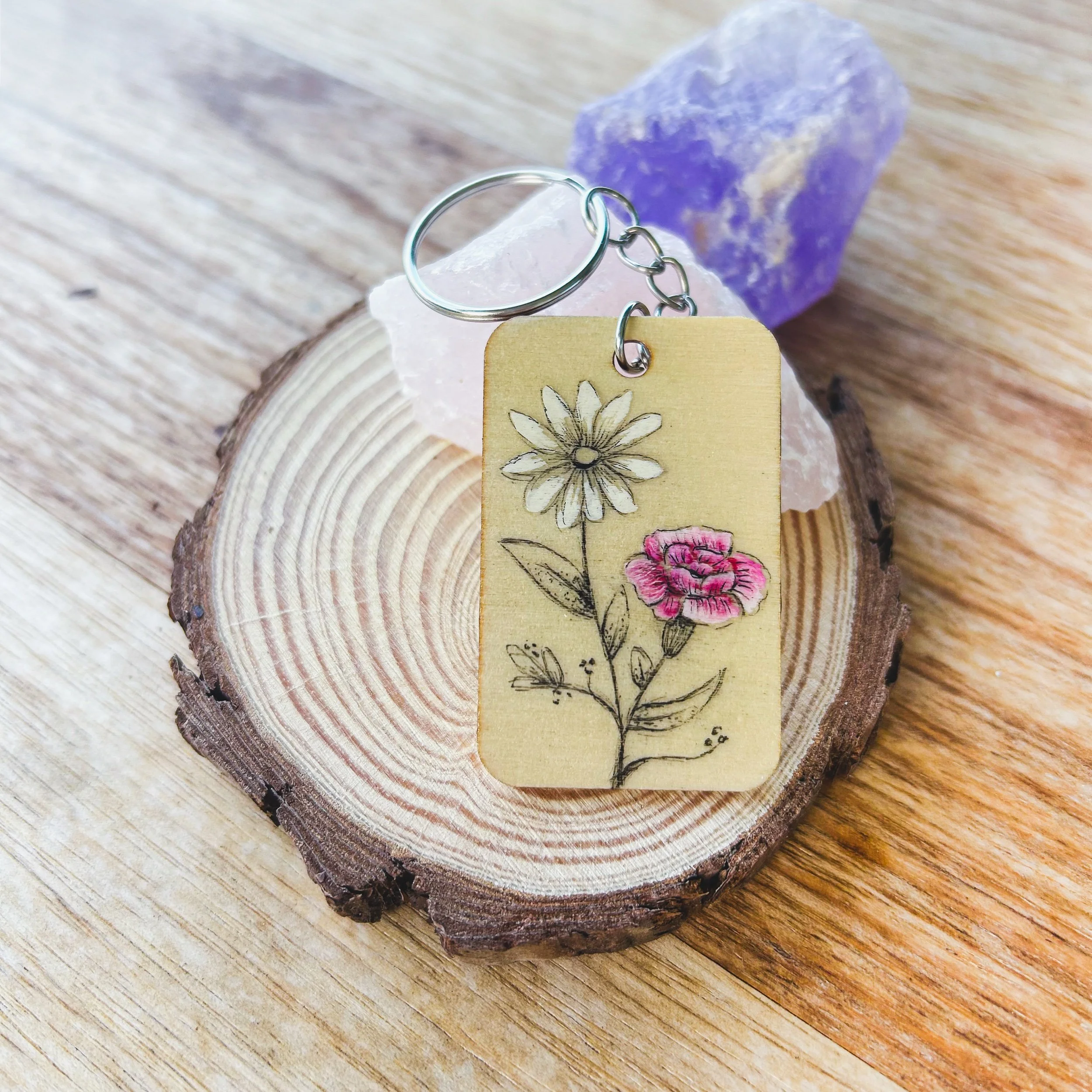These custom wooden key-rings are hand-drawn and completely one of a kind, created using your child’s (or children's) birth month flower as the inspiration. Each design is thoughtfully illustrated onto wood, making every piece as unique as the story behind it.