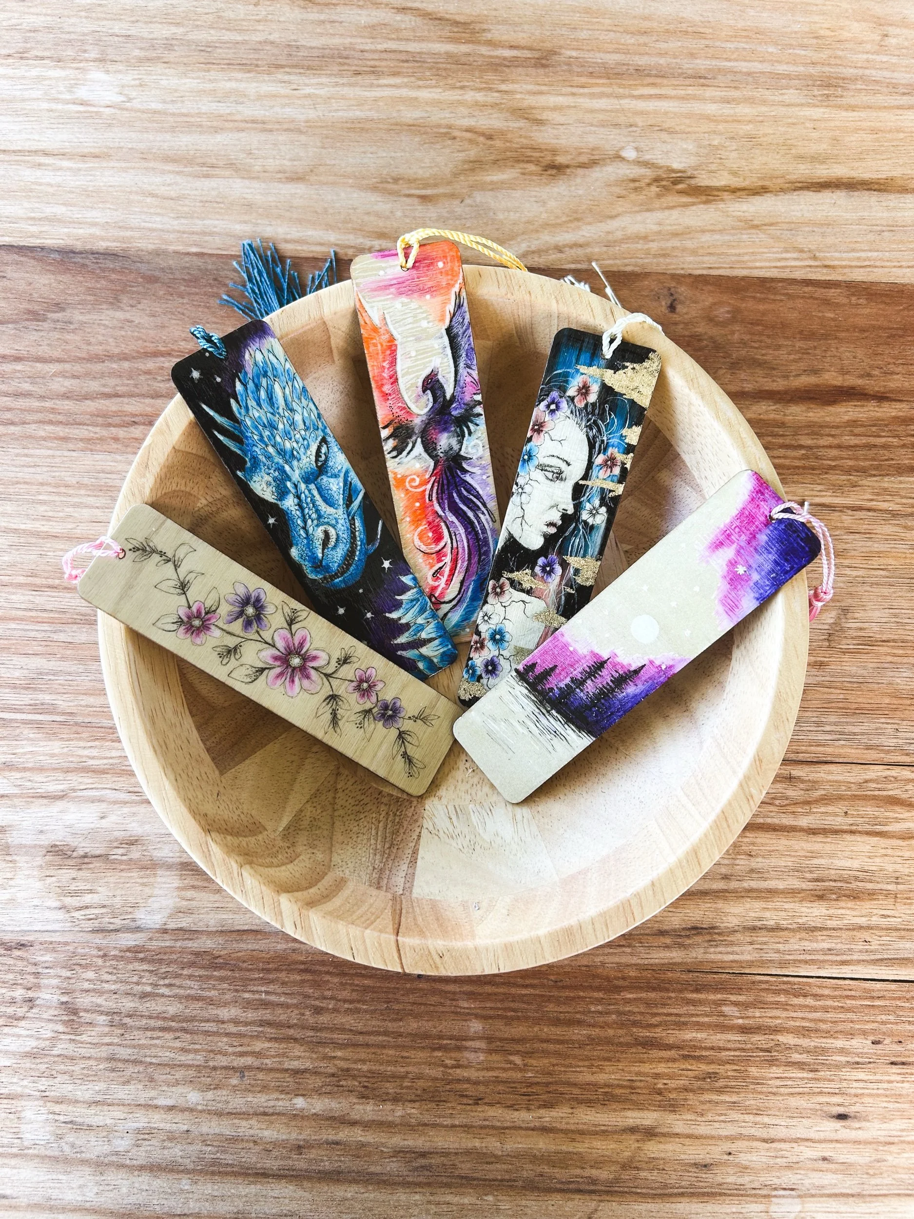 Drawn directly onto wood, no two are ever the same. Every line, pattern, and detail is completely unique, making each bookmark its own little story.